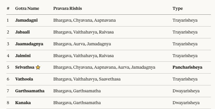 Bhrigu Lineage Gotras (20 Sub-Gotras)