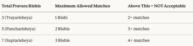 Important Distinction: The type of pravara greatly impacts marriage rules. When it comes to putra-parampra (father-son) direct lineage, the restrictions are very strict: Any pravara connection (matching Rishi) prohibits a marriage and is therefore NOT acceptable.