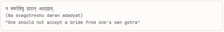 ❌not allowed: Groom’s gotra (Bharadwaja) + Bride’s gotra (Bharadwaja)